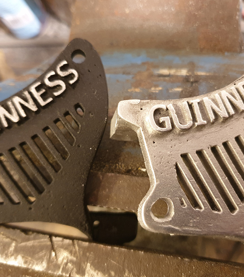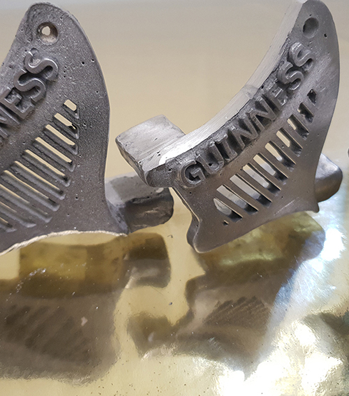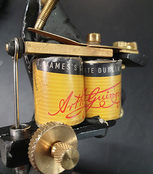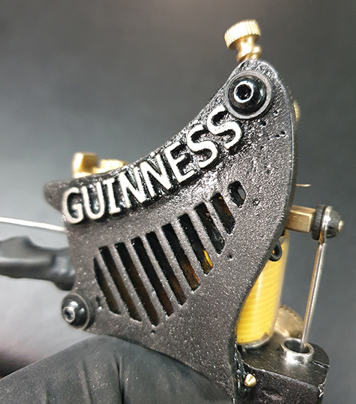 On the day of the party we have drink 100 cans of Guinness beer, We crushed the cans ,Melted the cans and using lost vax casting process made an Guinness tattoo machine frame. Frame was then fitted with gold plated hardware and Arthur Guinness signature coils. Finished machine made a tattoo of a Guinness Harp